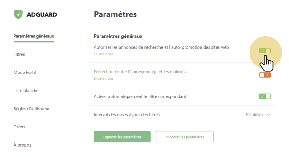 Ces bloqueurs fonctionnent avec des filtres. Les filtres de base sont activés.