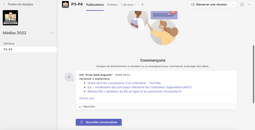 Lorsque les ordinateurs s’allument, Microsoft Teams est automatiquement démarré. Les enfants se retrouvent donc directement sur l’équipe “média 2022” que j’ai créé pour cette année.