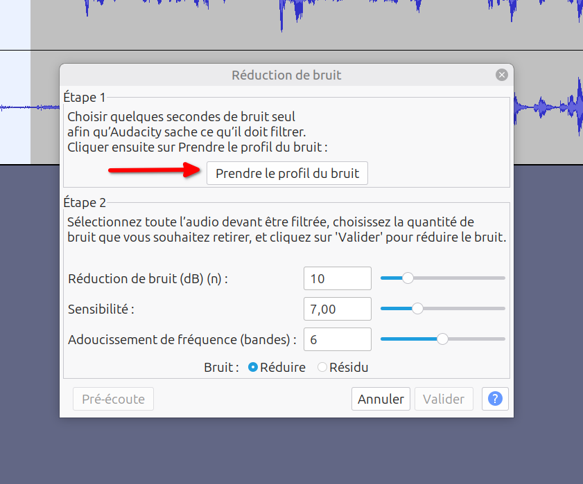 Avant de lancer la macro, une étape est cruciale : capturer un profil de bruit. Sans cela, Audacity ne saura pas quoi éliminer lors de la réduction du bruit de fond.